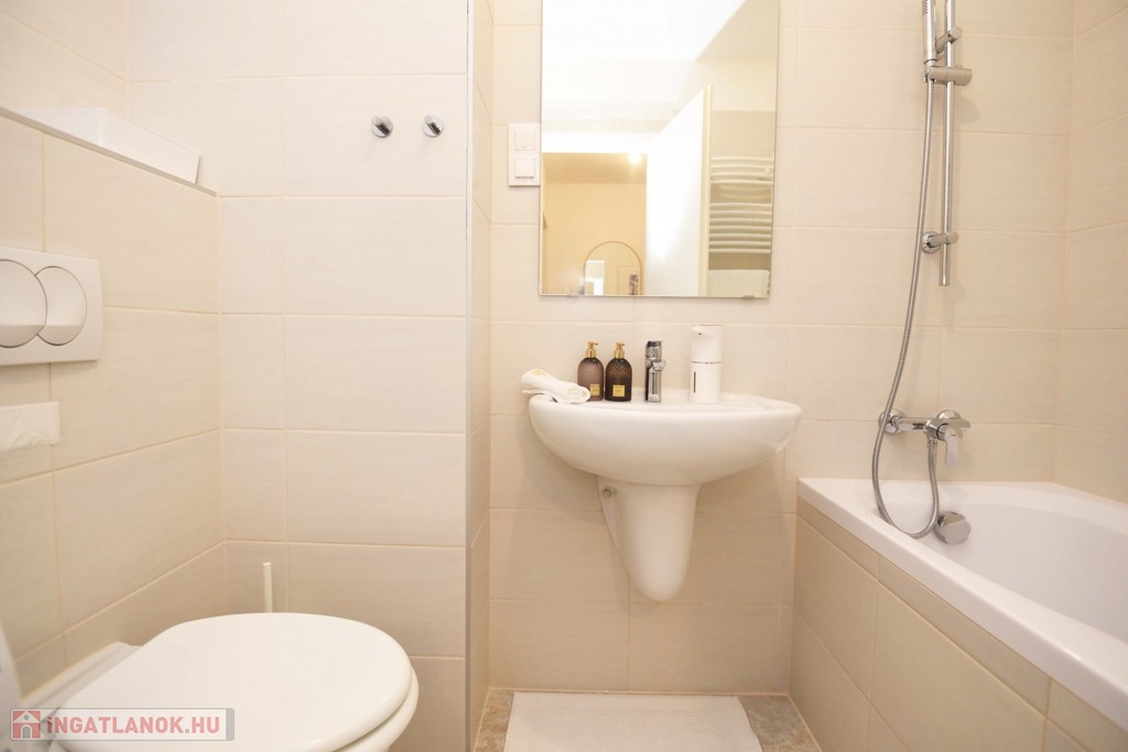 A 4,5 nm-es fürdőszoba kádas kialakítású, egy hosszú nap után kellemes kikapcsolódást nyújt egy nyugodt fürdő, miközben a világos, letisztult tér barátságos és kényelmes hangulatot teremt.