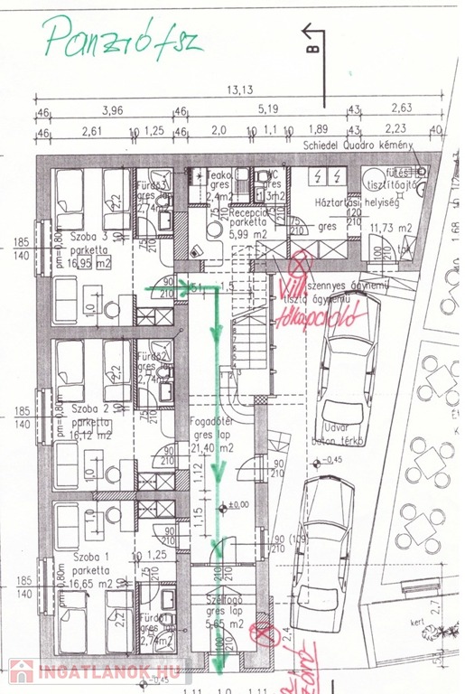 Műszaki jellemzők: a panzió klasszikus, pácolt fa oszlopokkal és borítással készült, kellemes érzetet kelt az ide érkezők számára. Az elektromos hálózat korszerű rézvezetékekre lett kicserélve, a zavartalan működés érdekében megemelt áramerősséggel és ipari árammal. A nyílászárók fából készültek. A fűtésrendszer gázcirkós, jó minőségű, lapradiátorokon keresztül biztosítja a megfelelő hőérzetet. Átalánydíja 10.000 Ft/hó. A belmagasság 2,70 m. Minden szoba légkondicionált.